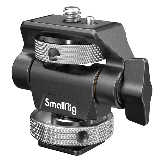 Swivel and Tilt Adjustable Monitor Mount with Cold Shoe Mount - Highly compatible cold shoe mount- Tightness adjustable on each axis, swivels 360° and tilts 180°- Tested durability, with tilt load capacity decreased by no more than 20% after 10,000 tilts- Bouncy locating pins and silicone pad prevent twisting- Holes in thumbscrews for quick release of the mount- 1/4"-20 threaded holesat the bottom for magic arm