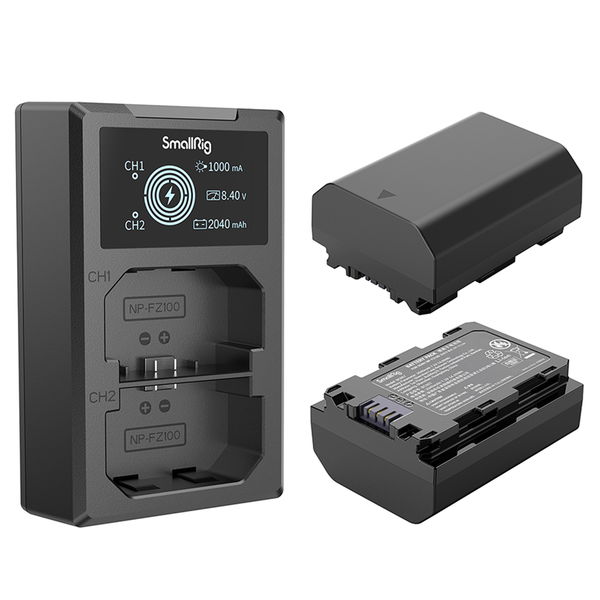 SmallRig NP-FZ100 Camera Battery and Charger Kit 3824B includes two batteries and one charger. The battery, equipped with a full decoding chip, supports varied cameras perfectly without causing pop-up windows and has quality fireproof ABS and PC shell frosted to ensure fine touch and durability. It is the same size as the original battery, thus fitting seamlessly into battery compartment. The dual battery charger can charge two batteries at the same time, with its LCD screen displaying real-time charging voltage, current and charged capacity.It comes with built-in USB-A charging cable and USB-C input interface, allowing it to be charged via USB adapter, car charger, power bank. - Fully Decoded Chip: the battery supports original camera and charger without causing pop-ups and enables power display.- Dual Fast Charging: quickly charges one or two batteries with high current output.- Digital Screen Display: LCD screen displays charging current,charging voltage, charging progress and charging capacity in real time.- Long Battery Life: 2040 mAh high capacity brings long battery life.- Multi-ways of Charging: built-in USB-A charging cable and USB-C input interface allow being charged via charger, car charger, power bank. Compatible Models:Sony a6600 / a9 II / a7 III / a7R III / a1 / a7C / a7S III / a7R IV / a7R V / a6700 / FX3 / FX30 / a7CR / a7C II / a7 IV / ZV-E1