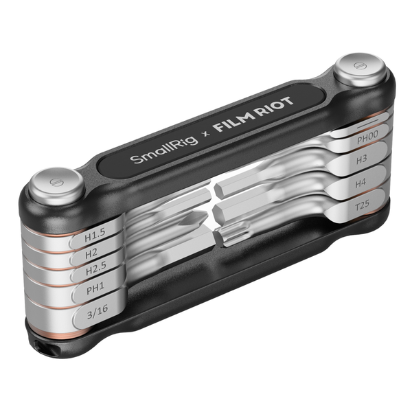 SmallRig x FILM RIOT 10-in-1 Folding Wrench Set with Multiple Angle Positioning (Black) - The wrenches offer fixation at 90° or 180° angle.- Portable folding design for convenient storage and transportation.- 10-in-1 wrench set includes six Allen wrenches (1.5mm, 2mm, 2.5mm, 3mm, 4mm, 3/16), one flathead wrench, two Phillips wrenches; and one Torx T25 wrench.- Metal structure with silicone coating for a non-slip, skin-friendly grip, and robust durability.