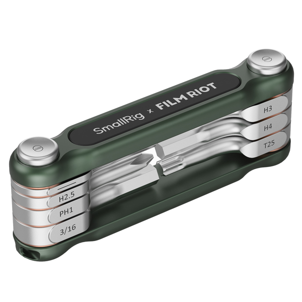 SmallRig x FILM RIOT 7-in-1 Folding Wrench Set with Multiple Angle Positioning (Green) - The wrenches offer fixation at 90° or 180° angle.- Portable folding design for convenient storage and transportation.- 7-in-1 wrench set includes four Allen wrenches (2.5mm, 3mm, 4mm, 3/16), one flathead wrench, one Phillips wrench; and one Torx T25 wrench.- Metal structure with silicone coating for a non-slip, skin-friendly grip, and robust durability.