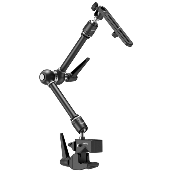 - Two-section adjustable extended magic arm (524mm / 20.6in) provides versatile angle adjustments for a wide range of shooting scenarios;- Anti-deflection connection ensures secure equipment mounting during shooting;- Detachable wedge design allows for secure clamping of both flat surfaces and cylindrical objects. SmallRig Super Clamp Magic Arm Kit 4862 offers an ideal solution for users of compact devices like smartphones, webcams, and action cameras. The kit includes an adjustable magic arm, a super clamp, and a 1/4"-20 to 3/8"-16 threaded adapter.The magic arm, measuring 524mm (20.6in) in length, securely attaches to the super clamp using an anti-twist 1/4"-20 top screw. The super clamp can securely grip round tubes with diameters ranging from 10mm to 55mm (0.4in to 2.2in) when the wedge block is removed. With the wedge block in place, it can clamp flat surfaces up to 30mm (1.2in) thick. The clamp jaws feature built-in pads to protect clamped objects and enhance grip stability.The magic arm ball head features a non-slip rubber ring that increases friction, ensuring a secure grip on your device.