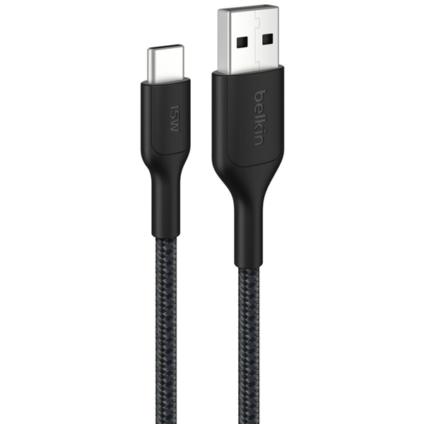 BoostCharge Pro Braided USB-A to USB-C Cable 15W, 3.3ft/1m, Black The BoostCharge Pro USB-A to USB-C charging cable 15W combines sustainability and performance, powering your iPhone 16 from 0-50% in 45 mins[1]. Durable and sustainable, it withstands 350K+ bends and 20K+ plugs[2], and is compatible with iPhone 16, Samsung Galaxy S25, and most tablets for a greener future. - Made with Post Consumer Recycled (PCR) Materials[3]- Allows for fast charging of an iPhone 16 from 0-50% in 45 minutes[1]- 95% PCR PET exterior braiding; 50% PCR TPE material in cable boot, strain relief and jacket help to reduce plastic waste without compromising charging performance