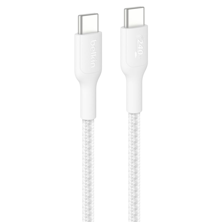 Belkin 240W Braided USB-C Cable - 1m - White Sustainability meets durability in the new BoostCharge Pro USB-C to USB-C Braided Cable 240W. Fast charge your iPhone 16 from 0-50% in 25 minutes, and Macbook 2021 from 0-50% in 30 minutes. Built to last, this braided nylon cable survives 350,000+ bends &; 20,000+ plug ins. - iPhone 16 from 0-50% in 25 minutes and Macbook 2021 in 0-50% in 30 minutes- Recycled braided nylon exterior allows for added flexibility and handling - External braiding is made of 94.5% post-consumer recycled polyester. Cable head and internal jacket are made of at least 50% post-consumer recycled thermoplastic- Safely and durably built to survive 350K+ bends and 20K+ plugs- Premium quality materials and design - Compact and easy to carry and store - USB-IF-certified - Compatible with iPhone 16 and Samsung Galaxy S25 and earlier Note * Charges iPhone 16 from 0-50% in 25 minutes and Macbook 2021 in 0-50% in 30 minutes when paired with a 140W charger. Charge time varies with environmental factors; actual results will vary. ** External braiding is made of 94.5% post-consumer recycled polyester. Cable head and internal jacket are made of at least 50% post-consumer recycled thermoplastic.