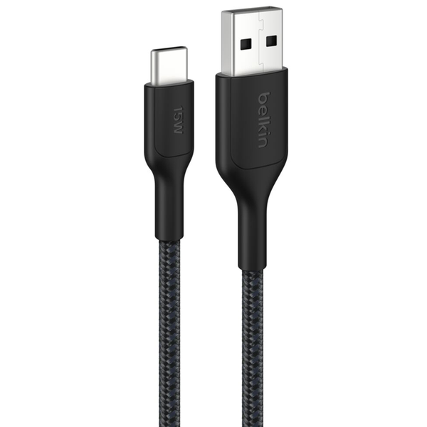 BoostCharge Pro Braided USB-A to USB-C Cable 15W, 6.6ft/2m, Black The BoostCharge Pro USB-A to USB-C charging cable 15W combines sustainability and performance, powering your iPhone 16 from 0-50% in 45 mins[1]. Durable and sustainable, it withstands 350K+ bends and 20K+ plugs[2], and is compatible with iPhone 16, Samsung Galaxy S25, and most tablets for a greener future. - Made with Post Consumer Recycled (PCR) Materials[3]- Allows for fast charging of an iPhone 16 from 0-50% in 45 minutes[1]- 95% PCR PET exterior braiding; 50% PCR TPE material in cable boot, strain relief and jacket help to reduce plastic waste without compromising charging performance