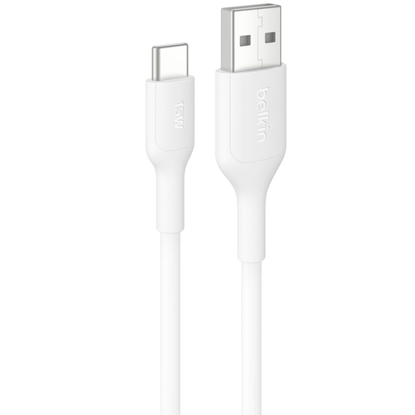 Fast and Efficient Charging The Belkin BoostCharge USB-A to USB-C Cable is designed to deliver reliable performance across a wide range of devices. Capable of charging your iPhone 16 and earlier models from 0-50% in just 45 minutes[1], it also works seamlessly with Samsung Galaxy S25 and earlier smartphones, along with most tablets. With its 15W power capacity, it ensures your devices get the power they need quickly and efficiently. Extended Length for Versatility With its generous 6.6ft (2m) length, this cable provides the flexibility to charge your devices comfortably, even when the power outlet isn't nearby. Whether you're at your desk, on the couch, or in bed, the longer cable makes it easy to use your device while charging, offering convenience and practicality for everyday use. Eco-Friendly Design Belkin's first cable made with recycled materials, the BoostCharge USB-A to USB-C Cable demonstrates a strong commitment to sustainability. Featuring 50% PCR (post-consumer recycled) TPE in the cable boot[2], strain relief, and jacket, it reduces plastic waste while maintaining top-tier performance. Certified under the Global Recycled Standard 4.0 by Intertek (TE-00114861), it offers both eco-conscious construction and dependable functionality. Durable and Reliable Build Engineered for long-lasting performance, this cable is built to withstand over 300,000 bends and more than 20,000 plug-and-unplug cycles[3]. The robust construction ensures that it won't easily fray or wear down, making it a dependable accessory for daily charging needs. Its premium-quality materials also provide strength without compromising on flexibility. Certified Safety and Quality The BoostCharge USB-A to USB-C Cable is USB-IF certified, meaning it meets strict industry standards for charging safety and performance. Belkin's attention to quality and craftsmanship ensures that this cable provides safe, efficient charging across supported devices, giving you peace of mind and consistent reliability. Note: [1]15W capacity allows for charging iPhone 16 from 0-50% in 45 minutes. Charge time varies with environmental factors; actual results will vary. [2]Cable head and internal jacket are made of at least 50% post-consumer recycled thermoplastic.