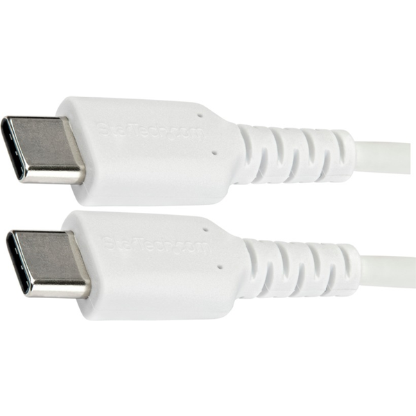 This USB C cable withstands the daily demands of charging and syncing your mobile devices. Compatible with your Thunderbolt 3 ports, this rugged cable is a must-have for both business and consumer applications. Built for Daily Use The durable USB C charging cable has aramid fiber reinforcement that shelters it from the stress of frequent bends. This also lets the cable flex without over-stretching or damaging the core of the cable. Cable Key Features - Aramid fiber adds strength and durability to the cable- Insulated conductors reduce friction, provide more flexibility- EMI (electromagnetic interference) protection with aluminum-mylar foil with braided shielding- TPE (thermoplastic elastomer) cable jacket is more flexible than a standard PVC cable Flexible Strain Relief The USB C to USB C cable is constructed to prevent the connector from separating from the jacket. The extra-long strain relief molding is tested to withstand over 10,000+ bend cycles at a 180° angle. Connector Key Features - USB Type C connector provides 3A of power output for charging your USB C compatible devices- Metal shield protects circuit board from EMI and reinforces the connection point- Strain relief tested to tolerate over 10,000+ bend cycles at a 180° angle Superior Connection The durable cable supports all USB 2.0 specifications providing a dependable connection for all your USB-C devices. It also delivers up to 60W of power to charge your devices without needing an additional power supply. RUSB2CC1MW is backed by a StarTech.com 2-year warranty and free lifetime technical support. Note: DuPont™ and Kevlar® are trademarks or registered trademarks of E.I. du Pont de Nemours and Company.