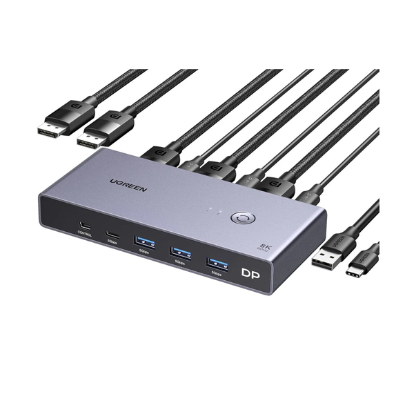 ?Displayport KVM Switch 1 Monitor 2 Computers?This DP KVM Switch allows 2 computers to share a monitor and 4 USB 3.0 devices such as keyboard, mouse, hard drives, flash drive and printer. It is not only a DisplayPort switch, but also a keyboard and mouse switch. You can easily switch between two computers, which not only keeps your workspace tidy, but also helps maximize productivity. ?UHD 8K Resolution @ 60Hz?This 2-port DP 1.4 KVM switch supports resolutions up to 8K @ 60Hz and is backward compatible with 4k @ 240Hz, 4k @ 144Hz, 4k @ 120Hz, 4K @ 60Hz, 2560*1440 @ 240. Provides clear, high-quality images and lag-free transmission. ?Displayport KVM Switch with 4 USB 3.0 Ports?This 8K DisplayPort KVM features 4 USB 3.0 ports (3 USB-A + 1 USB-C) for sharing USB storage devices, printers, mobile hard drives, flash drives and other USB 3.0 and USB 2.0 devices. The USB 3.0 ports provide data transfer speeds of up to 5Gbps, allowing you to transfer files and images faster, making your work and life easier and more convenient. [NOTE: When connecting high-power devices such as hard drives, please connect the charger and Type-C C cable to the power source.] ?Two Ways to Switch?With the one-button switch or wired remote, you can switch between two computers freely, saving desk space and sharing the display, keyboard and mouse between 2 computers, improving productivity. If the DP switch is not placed on the desktop, the wired remote will be a good helper for quick switching. [NOTE: This KVM Displayport switch does not support keyboard hotkey switching]. ?Wide Compatibility?This DisplayPort KVM Switch supports Windows 11/10/8.1/8/7, Mac OS and Linux (Ubuntu) operating systems. Just plug and play, no drivers required. It is widely used in enterprises, offices, multimedia teaching, conference rooms, game rooms, homes, etc. ?Notes?1. Both USB A to C cables must be connected for power.2. The USB-C power cable and power adapter are not included.3. To avoid incompatibility, it is not recommended to use the KVM with a docking station. Technical specifications: Manufacturer: UGREEN Input: 2*DisplayPort, 1*USB-C, 1*Mini USB, Output: 1*DisplayPort, 3*USB-A, 1*USB-C, Supported resolutions: 8k 60hz, 4k 240hz, 4k 144hz, 4k 120hz, 4k 60hz, 2k 240hz, 2k 165hz, 2k 144hz, 2k 120hz, 2k 120hz, 2k 120hz, 2k 60hz, 1080P 240hz, 1080P 120hz, 1080P 60hz, HDCP version: 2.3 and backward compatible, Color depth: 24 bit/30 bit/36 bit, Pixel formats: RGB/YCbCr 4:4:4/YCbCr 4:2:2/YCbCr 4:2:0, Audio format: support LPCM/DTS/DSD 2.0/2.1/5.1/7.1 channels, Audio sampling rate: 24 bit/192 kHz max. Video support: 3D, HDR10, HDR10+, VRR, Switching modes: button/remote control, Auxiliary power: Type-C 5V-3A max, Dimensions: 142*63*21 mm Package Contents:1 * KVM DisplayPort 1.4 Switch 8k2 * USB-A USB-C Cable 1.5 m2 * DP DP Cable 1 m1 * Wired Remote Control 1.5 m