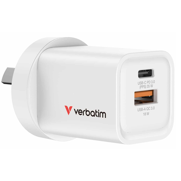 https://www.verbatim.com.au/products/35w-2-port-gan-wall-charger/ Verbatim's 35W GaN Wall Charger combines one USB-C PD 35W port and one USB-A QC 3.0 port in a sleek, palm sized design. Ideal for the office, home or travelling to power your tablet, smartphone, gaming devices, and more. This product's housing is constructed with 95% post-consumer recycled plastic. This recycling process reduces the need for virgin plastic production and diverts plastic waste from landfill and oceans, contributing to a more sustainable and eco-friendly approach to plastic use. In addition, the packaging is 100% plastic free, thus supporting Verbatim's global commitment to a healthier planet. - Charge 2 devices simultaneously- Ultra compact size: 67.5 x 39.2 x 39.2mm- Maximum output of 35W- Equipped with 1 x USB-C® PD 3.0 up to 35W and 1 x USB-A QC 3.0 up to 18W- Supports super-fast charging with USB Power Delivery 3.0, PPS, and Quick Charge 3.0- Programmable Power Supply (PPS) technology delivers the right amount of power needed for the ideal charge- 95% PCR Plastic Housing- 100% Plastic-Free Packaging- Made with high-quality, flame-resistant materials and featuring four safety protection systems, including over-current protection, over-voltage protection, short circuit protection, and over-temperature protection