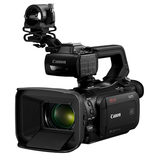 Get your shot, tell your story Shoot high quality 4K UHD video with the compact XA75. As well as outstanding Over Sampling HD processing, Dual Pixel CMOS AF, a Canon 15x optical zoom lens and HD livestreaming in UVC1 via USB-C over a computer, capture high quality footage in either XF-AVC or MP4 formats. Compact professional 4K UHD camcorder Capture stunning 4K UHD and superior Full HD images thanks to a 1.0-inch Type CMOS 4K sensor and DIGIC DV6 image processor. Over Sampling HD processing delivers Full HD images from the sensor. 4K 15x optical zoom lens The Canon lens covers a 25.5 - 382mm (35mm equivalent) range. A digital zoom boosts to 300x with 5-axis image stabilisation. Fast, precise focusing with face detection Adjustable focusing speeds and advanced Dual Pixel CMOS AF give fast and precise focusing. Use the 3.5-inch LCD display to set focus by touching the AF point required. Face Detection AF and Face Tracking are available while Manual Focus is set via the focus/zoom ring. XF-AVC and MP4 for flexible recording Choose from XF-AVC or MP4 recording formats. Record XF-AVC 4K UHD 160Mbps at 25P, plus Full HD 45Mbps at 50P/50i/25P. For smaller files, record MP4 4K 150Mbps at 25P and Full HD 35Mbps or 17Mbps at 50P/25P. Multiple shooting functions Output options include 3G-SDI, simultaneous backup and relay recording via dual SD card and Infrared mode. For specialist capture, record Slow Motion in Full HD 0.5x or Fast Motion in 4K/Full HD up to 1200x. Colour match with other Canon cameras via the custom picture menu. Livestream and more Stream HD footage via UVC1 over a computer or add a date and time stamp with OSD recording. Two XLR terminals on a detachable handle plus 4-channel linear PCM bring pro audio options.