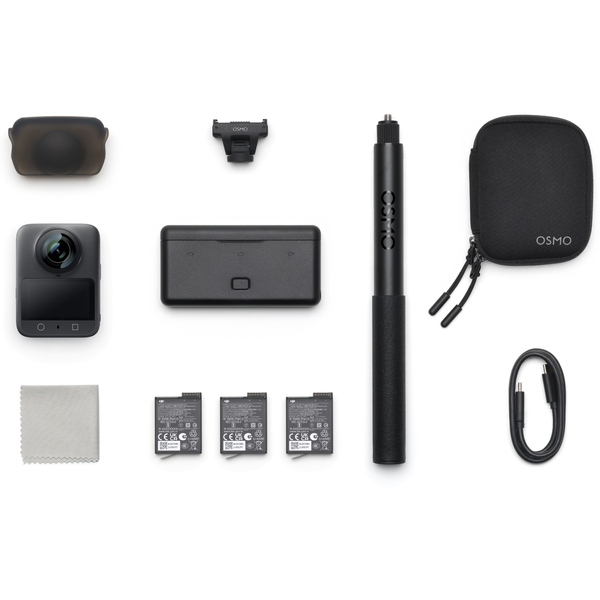 Extensive Accessories, Reliable Assistance Osmo 360 Battery Extension Rod [13]Featuring a built-in high-capacity battery, the battery extension rod magnetically connects to Osmo 360 and extends 8K/30fps video recording time up to 4.5 hours [2]. The rod extends up to 90 cm and supports camera controls like sleep/wake, record start/stop, and more. The quick-release design offers two adjustable positions, enabling seamless switching between invisible selfie stick shots and single-lens selfies. Osmo Motorcycle Heavy-Duty Mount [13]Crafted from all-metal construction, this rugged mount ensures a secure, reliable hold for your camera-even during intense vibrations [16]. It supports quick angle adjustments for flexible and dynamic shooting perspectives. Osmo Dual Heavy-Duty Clamp [13]Quick to tighten and built to last, this clamp pairs with the Motorcycle Heavy-Duty Mount and High-Strength Carbon Fiber Invisible Selfie Stick for secure, stable third-person motorcycling shots. One end can be replaced with a 1/4" thread hole for greater convenience. Osmo Bike Rear Mount Kit [13]Pair with an invisible selfie stick to effortlessly capture epic third-person 360° cycling shots. The adjustable design supports quick angle changes for flexible shooting perspectives, while the dual-point support structure ensures enhanced stability and reliability. Osmo Adjustable Quick-Release Adapter Mount [13]Featuring a magnetic quick-release design, this mount ensures a secure and reliable connection with the camera. It is compatible with 1/4" threaded invisible selfie sticks for easy installation. The adjustable tilt makes it easy to fine-tune the camera angle for more accurate single-lens framing. Osmo Third-Person Helmet Mount Kit [13]The curved base fits snugly against the helmet and adheres firmly to stay in place. Paired with a high-strength carbon fiber straight rod, it enables a distinctive third-person tracking perspective. Osmo 70cm Invisible Selfie Stick [13]When used with Osmo 360, the selfie stick disappears from the shot, enabling a dramatic third-person perspective[17]. Its lightweight design collapses to palm size, making it easy to carry anywhere. Osmo 1m High-Strength Carbon Fiber Invisible Selfie Stick [13]When used with Osmo 360, the selfie stick disappears from the shot, enabling a dramatic third-person perspective. Made of high-strength carbon fiber, it's both lightweight and durable-reliable even during intense action. Osmo 1.2m Invisible Selfie Stick Kit [13]When used with Osmo 360, the selfie stick disappears from the shot, enabling a dramatic third-person perspective [17]. It extends up to 1.2 meters, offering a wider field of view. The adjustable quick-release adapter mount supports fast angle adjustments, achieving either the invisible selfie stick effect or precise single-lens framing. Osmo 1.6m Tripod Selfie Stick [13]Specifically designed for stationary 360° shots, this tripod selfie stick captures expansive scenes from optimal angles with rock-solid stability. Its lightweight yet durable build unfolds quickly [18], ensuring a smooth and efficient shooting experience. Osmo 2.5m Extended Carbon Fiber Selfie Stick [13]When used with Osmo 360, it offers special side-tracking views reminiscent of drone footage, making it easy to capture spectacular 360° footage. Made of high-strength carbon fiber, it's both lightweight and durable-reliable even during intense action. Osmo Vortex Rotating Handle [13]Pair it with an invisible selfie stick to effortlessly capture breathtaking 360° Vortex shots. Equipped with a 1/4" thread hole, it can also function as a tripod [19]. Notes1. When capturing 360° content, Osmo 360's CMOS sensor features an imaging area equivalent to that of a 1-inch CMOS sensor with a 4:3 aspect ratio.2. Measured under laboratory conditions at 25° C (77° F), while recording 8K/30fps 360° video, with Wi-Fi off, Gesture Control off, Voice Control off, Editing Assistant off, and the screen off. Data was collected in a controlled environment and should be taken as reference only. When activating and using Osmo 360 in the EU and the UK, actual battery life may vary due to local regulations on product operating temperatures. Refer to the actual user experience.3. Direct connection to the first-generation DJI Mic is not supported. DJI microphones are sold separately.4.