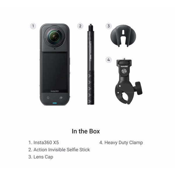 Insta360 X5 360° Waterproof 8K Action Camera Motorcycle Multiview Bundle - includes 1 x Insta360 X5, 1 x Lens Cap, 1 x Action Invisible Selfie Stick and 1 x Heavy Duty Clamp