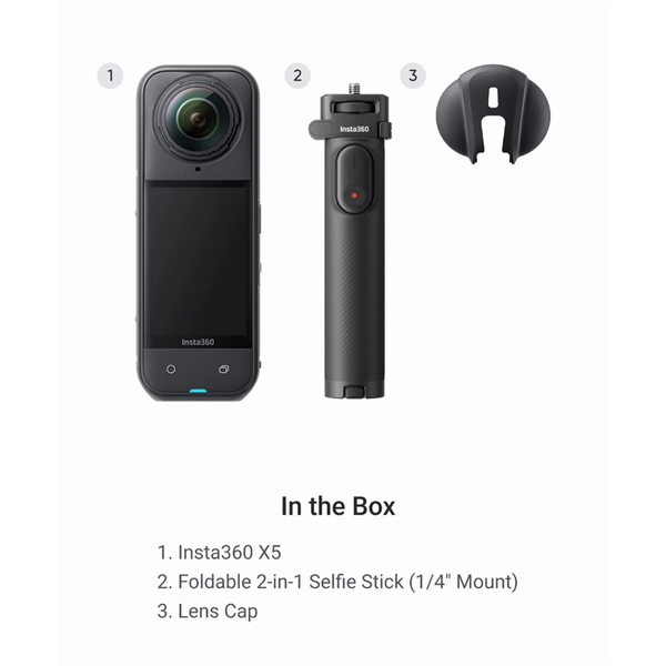 Insta360 X5 360° Waterproof 8K Action Camera Foldable Selfie Stick Bundle - Includes 1 x Insta360 X5 , 1 x Lens Cap and 1 x Foldable 2-in-1 Selfie Stick (1/4" Mount)