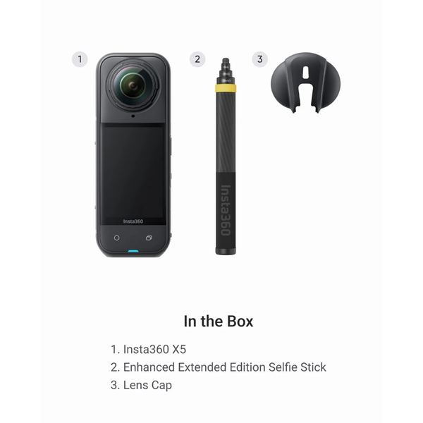 Insta360 X5 360° Waterproof 8K Action Camera No Drone No Problem Bundle - Includes 1 x Insta360 X5, 1 x Lens Cap and 1 Enhanced Extended Edition Selfie Stick.
