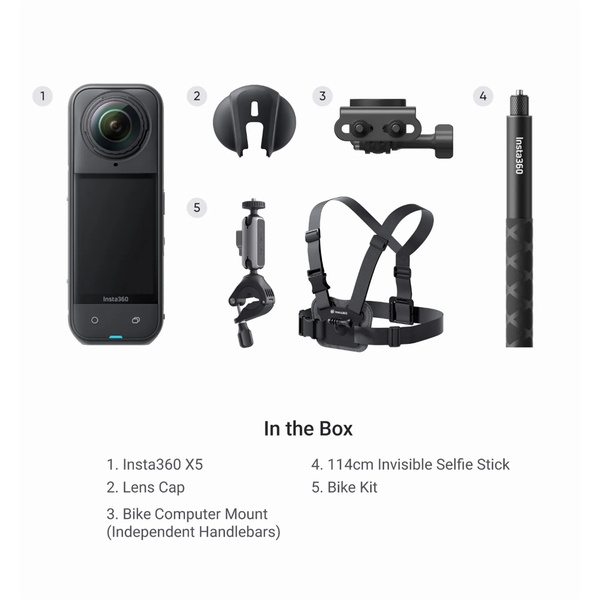 Insta360 X5 360° Waterproof 8K Action Camera Road Cycling Bundle - Includes 1 x Insta360 X5, 1 x Lens Cap, 1 x 114cm Invisible Selfie Stick, 1 x Bike Computer Mount (Independent handlebars) and 1 x Bike Kit.