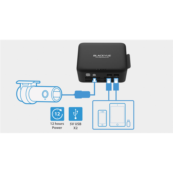 12V and 24V compatibility. Power Magic Battery Pack recharges itself while driving (full charge in one hour). Powers your dashcam while parked (up to 12 hours with a single-channel BlackVue).