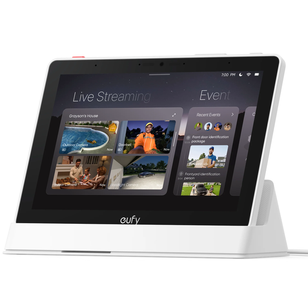 eufy Smart Display E10 - Instant Hands-Free Door Alerts: When someone rings the doorbell, unlocks the door, or is detected by the camera, the display automatically lights up with a live feed and a voice alert. - See Everything with Four Views on One Screen: View your entire property at a glance through four simultaneous live feeds while maintaining - full control and near-instant access to live video streams. - Instant Playback, No Waiting, No Buffering: Historical events are automatically downloaded to local storage so you can replay past moments instantly-no delays, no buffering. - Smart Daily Reports with Key Security Events: Using advanced facial and package recognition (powered by HomeBase S380), the display intelligently compiles daily summaries, including stats and video recordings for quick insights. - Monitor Everything, Anytime, Anywhere: The user-friendly 8-inch touchscreen is simple enough for kids and seniors, ensuring ease of use for everyone. Designed for flexible monitoring wherever you need it. Proactive Door Security,Minimize Missed Visitors When someone rings the doorbell, unlocks the door, or is detected by the camera, the display automatically lights up with a live feed and a voice alert, Know who's there instantly, hands free. Real-Time Feeds, Delivered in 3 Seconds Thanks to eufy cutting-edge technology, you get near-instant access to live video streams. The moment something happens, you're instantly in the know. Instant Playback, No Waiting, No Buffering Historical events are automatically preloaded locally during charging, allowing instant replay without delays or buffereing. Maximize Your Security View, Four Cameras, One Display With eufy's powerful display, you can view your entire property at a glance throught four simultaneous live feeds. Respond Faster, Review easier View four lives feeds simultaneously for immediate awareness. Plus, easily review past events with the cross-camera tracking feature, making a navigation effortless Know Your Day's Security at a Glance With advanced facial and package recognition intelligently compiles daily summaries, including counts and video recording for quick insights. 8-Inch Touchscreen,Effortless for all Ages With its user-friendly 8-inch touchscreen, this display is simple enought for kids and intuitive engough for seniors, ensuring ease of use for everyone. All-Day Power, One Simple Charge Powered by a built-in 4050mAh rechargeable battery, enjoy at least 24 hourse of uninterrupted performance on a single charge. 8Gb Storage Expandable to 512GB Store all your security foortage with ease- 8GB of built in storage and expandable support for up to a 512GB microSD card. Portable and Versatile: Monitor Anywhere, Anytime Designed for ultimate flexibility, this portable device comes with multiple accessories, allowing you to hold it, place it on a table, or mount it on a wall for monitoring wherever you need it. One-Touch Emergency Alert With a dedicated physical button, quickly trigger an emergency alarm with a single press for immediate response. One-Click Arm and Disarm Heading out or coming home? Arm or disarm your system in seconds with just a single click. 2.4G/5GHz Wi-Fi6 Compatibility Experience faster speeds, greater stability, and enhanced connectivity with full Wi-Fi 6 support.