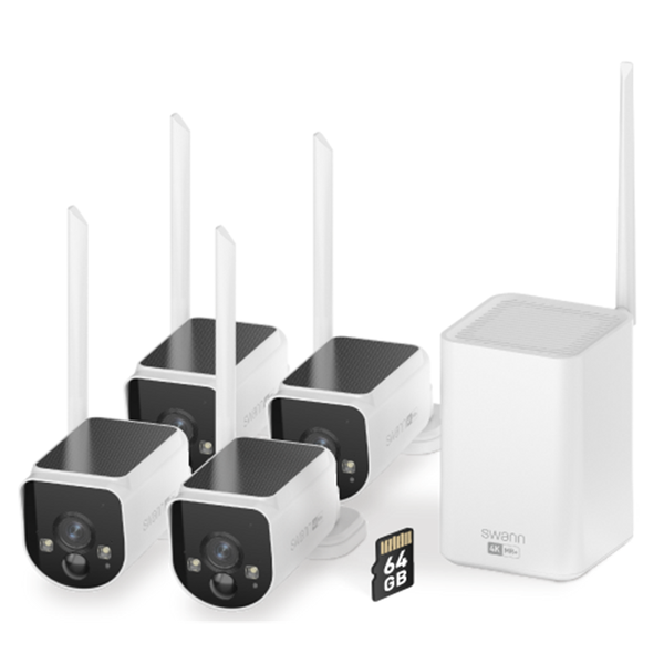 MaxRanger4K™ Solar 4 Camera Security System with Longest Range Wireless Swann's MaxRanger4K Solar Security System offers the longest range and strongest wireless signal with 20x the coverage of other Wi-Fi security systems and the ability to mount each of the 4K day/night Cameras anywhere outside up to 2,000ft/600m (in the open air) and 650ft/200m (for typical use) from the Hub. The 4 x Cameras have built-in solar panels, sensor lights, sirens, 2-way talk, color night vision, True Detect+ for heat, motion, people and vehicle-triggered alerts and recording to the Hub's 64GB local memory (to store up to 6 months rolling clips) with no monthly fees. View and control on the Swann Security app. Perfect for large homes, small business, rural properties, farms and more. It's longer, stronger and more reliable wireless security. Longest Range WirelessSee &; record what's happening up to 2,000ft/600m away with new long-range Wi-Fi technology Know What's HappeningTrue Detect+ senses heat, motion, people &; vehicles to trigger recording, alerts, spotlights &; sirens Strongest &; More Reliable WirelessThe cameras' unparalleled Wi-Fi strength penetrates walls &; other obstacles, with no signal drop-outs Sony STARVIS™ 4K SensorsSee crystal clear 4K Ultra HD color video during day, night &; in low light with best-in-class Sony STARVIS™ sensors Built-In Solar Panels100% wire-free cameras have the flexibility to move where they're needed most &; solar charging means no downtime Free RecordingUp to 6 months* of rolling recordings can be saved on the 64GB microSD card plus there's cloud backup Protect your Perimeter MaxRanger4K's extra-long wireless range is perfect to monitor fences, walls, gates, sheds, barns, fuel tanks &; hard to get to security 'blind spots'. Stronger &; More Reliable Signal The MaxRanger4K cameras have the strongest wireless to penetrate walls, floors, ceilings &; other obstacles with no signal drop-outs. See More Day &; Night The best-in-class Sony STARVIS sensors produce crystal clear 4K color video during the day &; night up to 100ft/30m. Forever Charged Use the built-in solar panels &; weatherproof IP66-rating to harness the power of the sun, avoiding manual recharging &; security downtime. Easiest Ever Setup The cameras &; hub are pre-paired for seamless connection to each other, scan the QR codes to have everything viewable &; controllable on the app in minutes. Free Recording &; No Downtime The hub includes onboard 64GB Micro SD &; cloud storage with no monthly fees. You can expand capacity by adding a MicroSD Card up to 256GB or connect an external hard drive via USB. There also battery back-up for up to 5 hours in the event of a site power outage. Actively Prevent Crime TrueDetect+ senses heat, motion, people &; vehicles to trigger mobile alerts, recording, spotlights &; sirens, to prevent unwanted activity. Everything is controllable using the Swann Security app. Talk to Visitors Use the microphone &; speaker to talk with people near the cameras. Scare off intruders or ask the delivery person to hide the package somewhere safe. Explore the MaxRanger4K™ Solar Security System Learn more about the key features and how to set up this system with maximum Wireless Range, maximum Security.
