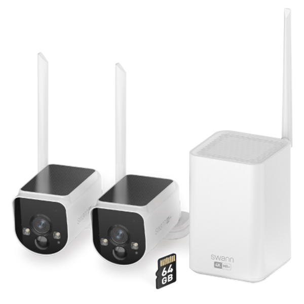 Meet Max - longest, strongest wireless security. Swann's MaxRanger4K Solar Security System offers the longest range and strongest wireless signal with 20x the coverage of other Wi-Fi security systems and the ability to mount each of the 4K day/night Cameras anywhere outside up to 2,000ft/600m (in the open air) and 650ft/200m (for typical use) from the included Hub. The 2 x Cameras have built-in solar panels, sensor lights, sirens, 2-way talk, color night vision, True Detect+ for heat, motion, people and vehicle-triggered alerts and recording to the Hub's 64GB local memory (to store up to 12 months rolling clips) and the cloud with no monthly fees. View and control on the Swann Security app. Perfect for large homes, small business, rural properties, farms and more. It's longer, stronger and more reliable wireless security. Longer Range, Greater Coverage MaxRanger4K uses the latest 900Mhz Wi-Fi Halow to generate longer, stronger more reliable transmission &; up to 20x more coverage than typical wireless camera systems. Protect your Perimeter MaxRanger4K's extra-long wireless range is perfect to monitor fences, walls, gates, sheds, barns, fuel tanks &; hard to get to security 'blind spots'. Stronger &; More Reliable Signal The MaxRanger4K cameras have the strongest wireless to penetrate walls, floors, ceilings &; other obstacles with no signal drop-outs. See More Day &; Night The best-in-class Sony STARVIS sensors produce crystal clear 4K color video during the day &; night up to 100ft/30m. Forever Charged Use the built-in solar panels &; weatherproof IP66-rating to harness the power of the sun, avoiding manual recharging &; security downtime. Easiest Ever Setup The cameras &; hub are pre-paired for seamless connection to each other, scan the QR codes to have everything viewable &; controllable on the app in minutes. Free Recording &; No Downtime The hub includes onboard 64GB MicroSD &; the ability to back up clips to your Dropbox account in the cloud. You can expand capacity by adding a MicroSD Card up to 512GB or connect an external hard drive via USB. There also battery back-up for up to 5 hours in the event of a site power outage. Actively Prevent Crime TrueDetect+ senses heat, motion, people &; vehicles to trigger mobile alerts, recording, spotlights &; sirens, to prevent unwanted activity. Everything is controllable using the Swann Security app. Talk to Visitors Use the microphone &; speaker to talk with people near the cameras. Scare off intruders or ask the delivery person to hide the package somewhere safe.