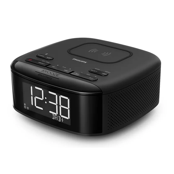 Packed with features A large, clear digital-time display glows at the front of this Bluetooth clock radio. Key controls are located on the top panel, which also hides a wireless Qi charging pad for your phone. For older-style phones, there's a USB charging port. DAB+/FM radio. Digital tuning with up to 20 presets From non-stop music to the latest news, this digital radio is your ticket to better listening! The DAB+ tuner delivers crystal-clear reception, and you can set up to 20 presets for your favorite stations. Sleep Timer. Drift off listening to your favorite tunes Drift into restful sleep with your favorite station playing in the background. You can set the clock's Sleep Timer to play the radio for up to 2 hours. After your preset time has elapsed, the radio turns off. Dual alarm. One clock, two wakeup calls The dual alarm function lets you set two different alarms, and wakes you to your favorite radio station or a buzzer. Perfect if you're likely to snooze through the first alarm. Or if your partner needs to wake before you. Auto time sync. Battery backup if the power fails This alarm clock automatically syncs time, and it also has a battery backup. If there's a power failure, you won't have to reset the clock and your alarm settings will be saved.