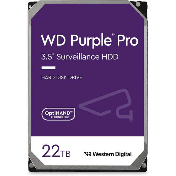 Advanced Storage for Smart Video Solutions WD Purple Pro drives are designed for advanced AI-enabled recorders, video analytics servers and deep learning solutions requiring additional capacity, performance and workload capability. Purpose-built storage for your smart video solution The WD Purple™ Pro HDD, with OptiNAND™ technology in 24TB1, delivers big capacity in an enterprise-class drive for video analytics servers, AI, and deep learning systems to enable data-driven outcomes. Western Digital's exclusive AllFrame™ AI technology AllFrame AI technology supports up to 32 AI streams for deep learning analytics within the system while reducing frame drops. Multiple cameras, multiple streams WD Purple™ Pro drives are optimized to handle up to 64 single-stream HD cameras2 in addition to 32 concurrent AI streams. This flexibility allows you to easily upgrade and scale your smart video solution to meet your changing needs. Advanced workload capability for advanced systems These reliable drives are built with a workload rating up to 550TB/year3 to keep up with the 24/7 data capture and analysis demands of advanced AI-enabled recorders, video analytics appliances, and deep learning analytics servers. Designed for reliable operation Engineered with an MTBF of up to 2.5 million hours4 and backed with a 5-year limited warranty, the WD Purple™ Pro HDD also features tarnish-resistant components and full multi-bay support for dependable operation in large-scale surveillance systems. Proactive storage management with WDDA™ Western Digital Device Analytics™ (WDDA) provides drive health management features for compatible recorders and video management systems.