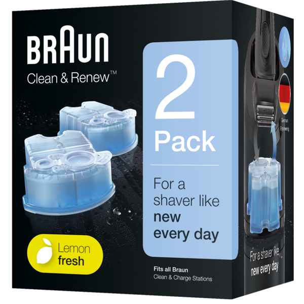 Braun Clean &; Charge cartridges hold cleaning fluid for Braun's clean &; charge stand with each cartridge lasting about 30 cleaning cycles. The cartridge installs quickly and easily, while the fluid cleans and lubricates the razor automatically and beard stubble cleaned from the razor is stored inside for no mess. - 2 refills per box- Keeps your shaver running in top form- Each cleaning cartridge lasts for about 30 cleaning cycles- With daily use, the cleaning cartridge should be replaced approximately every 4 weeks - High energy lubricants maintain your shavers performance, everyday. - A lemon-fresh formula ensures every shave is a refreshing exeperience. - Hygienically cleans to remove hair and residual skin particles. - Refills are fully compatible with all smart share and clean and charge units