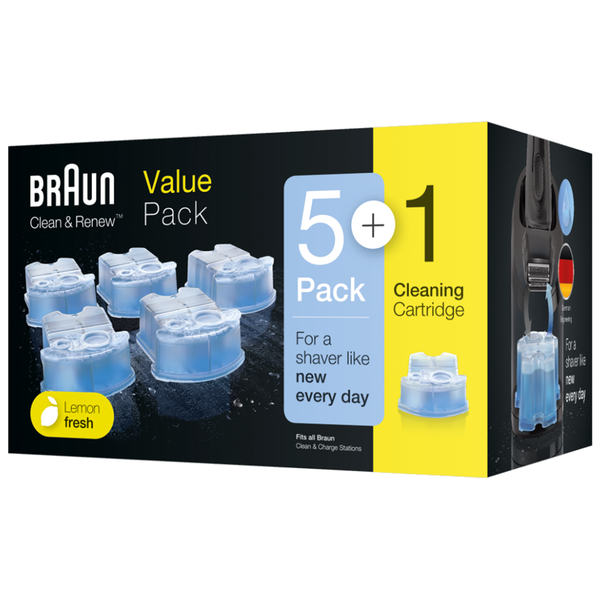 Braun Clean &; Charge cartridges hold cleaning fluid for Braun's clean &; charge stand with each cartridge lasting about 30 cleaning cycles. The cartridge installs quickly and easily, while the fluid cleans and lubricates the razor automatically and beard stubble cleaned from the razor is stored inside for no mess. - Pack of 6 cleaning refills- Refills are used in Braun's patented Clean&;Charge system base- During the cleaning cycle the cleaning formula automatically lubricates the blades for optimal cutting efficiency- One cartridge lasts approximately about 30 cleaning cycles - High energy lubricants maintain your shavers performance, everyday. - A lemon-fresh formula ensures every shave is a refreshing exeperience. - Hygienically cleans to remove hair and residual skin particles. - Refills are fully compatible with all smart share and clean and charge units