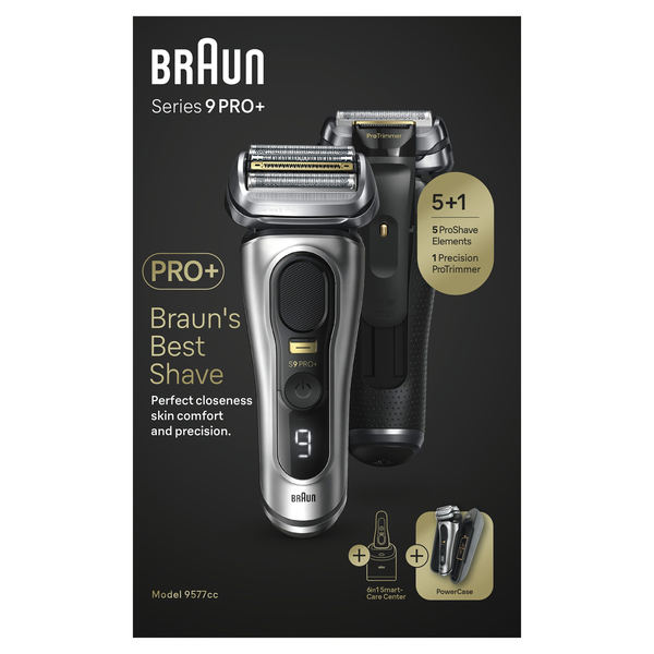 Braun Series 9 Pro 9577CC Wet &; Dry Shaver - Braun's best, better than ever before: Series 9 PRO+ redefines electric shaving to ensure ultimate closeness, skin comfort and precision.- No matter 1, 3, or 7-day beard: 5 perfectly synchronized shaving elements deliver exceptional efficiency and skin comfort, even on the longest &; trickiest hair in every stroke.- Ultimate precision even on tricky hair: Built-in precision Pro Trimmer, enhanced with surgical-grade steel, gives maximum cutting efficiency even on moustache, sideburns and under nose.- 2 Premium accessories: 6-in-1 SmartCare Center for a shaver like new every day &; mobile charging PowerCase for up to 90min of shaving without recharging.- Built to last for years: S9 PRO+ is 100% made in Germany. 100% waterproof. Powerful 60min Li-Ion battery runtime. Use wet or dry.