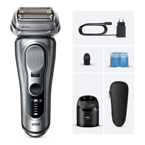 Braun Series 9 PRO+ electric shaver designed for men to achieve perfect closeness and skin protection. Ultra Thin Precision Blades deliver the ultimate shave. 5+1 Technology synchronizes perfectly across Direct&;Cut Blade, ProTrimmer, skin-skimming OptiFoil, protective SkinGuard and titanium-coated ProLift Blade. Pro SensoAdapt analyzes beard density at 300x/sec and automatically adjusts shaving power. Includes the 6in1 SmartCare Center, optimized by AutoSelect program, cleans, protects blade lifetime, dries, charges and maintains shaver performance. The Series 9 PRO+ electric razor for men is 100% waterproof. Made in Germany. Closeness even in tricky areas. Ultra adaptive 40° shaving head for maximum skin contact in hard-to-reach areas, like under chin and neck. High performance in every use. Performance assistant display guides you for the best shaver maintenance, with intuitive and easy to understand information, for a peak performance with ever use. 100% waterproof. Made in Germany. Tested to resist under water up to 24 hours. Wet or dry, with or without foam, this shaver is designed to last for years. For a shaver like new, everyday. The 6in1 SmartCare Center automatically selects the cleaning programm, hygienically cleans, protects blades lifetime, optimizes performance, automatically dries and charges your shaver. All at the touch of a button. Perfect closeness in every stroke Braun's Best electric shaver with 5+1 Perfectly Synchronized Shaving Elements to gently cut the toughest beards in every stroke Exceptional skin protection Ultra Thin Precision Blades shave more efficiently than any previous Series 9 electric shaver, resulting in exceptional skin protection Maximum efficiency on any beard density Pro SensoAdapt technology with high-precision sensors analyzes your beard density at 300x/sec and automatically adapts shaving power Premium accessory 6in1 SmartCare Center for a shaver like new every day Made in Germany, built to last for years The shaver is made from high-quality materials with the highest attention to detail. 100% waterproof for wet &; dry use. Up to 60-min Li-Ion battery runtime
