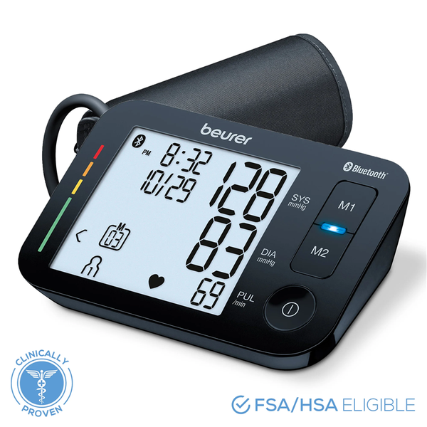 BM54 Upper Arm Blood Pressure Monitor with Bluetooth via Health Manager Pro App BM54 is Beurer's next generation of blood pressure machines. With a large display, one touch operation, and bluetooth syncing, our device is German-engineered for accuracy and precision. - WHO Risk Indicator- Irregular Heart Rate Detection- Averaging Function- Bluetooth via Health Manager Pro App- 120 Memory Sets- Unlimited Memory via App- XL LCD Display- Storage Case Included Averaging Function This function will average all blood pressure readings taken within a day. Then you can compare your average blood pressure day to day. This feature is optional and can be turned on or off. Accessories Included BM54 comes with: - Monitor with Large, LCD screen- Universal cuff (8.6" - 17.3")- Zipper storage pouch for monitor and cuff- (4) AAA Batteries Arrhythmia Detection If an irregular heart rate pattern is detected during a reading, a heart symbol with lines will flash on the screen. If this symbol appears, wait at least 5 minutes, and take your blood pressure again.