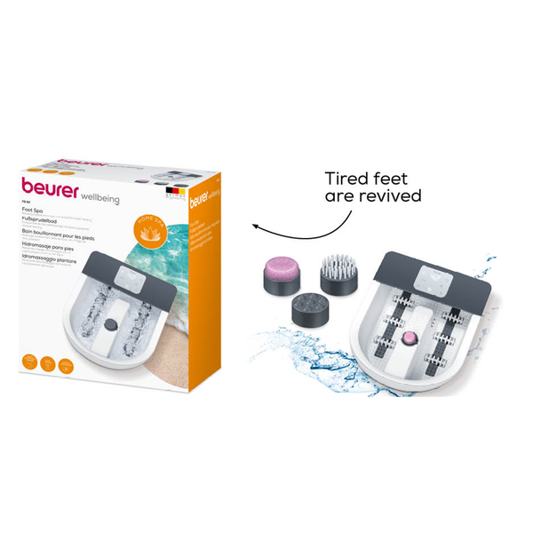 Beurer Foot Spa FB 60 Foot spa with water heating, bubble massage, vibration massage and 3 temperature zones. Strained feet can relax wonderfully with the FB 60 foot spa. Whether bubble or vibration massage, the built-in water heating gives tired feet a well-deserved wellness treatment. - Preset massage programmes and manual massage settings for easy and personal relaxation- 3 temperature zones for a perfect wellness experience- Dual-walled for better heat insulation- Nubs and extra-wide rollers for a relaxed massage on the underside of the foot- Premium touch screen- 3 pedicure attachments for well-groomed feet- Incl. storage and drying bag- Practical carrying handles- Non-slip rubber feet incl. cord winder- Can be used for shoe sizes up to 51 Accessories Includes 3 high-quality attachments Bubble massage The product is equipped to perform a revitalising bubble massage. The product is equipped to perform a revitalising bubble massage. Gentle vibration massage Vibrationmassage for stress reduction Vibrationmassage for stress reduction *Intended use This device is solely intended for foot massage on people. The device is only intended for private use, and not for medical or commercial purposes. Use the device for the purpose it was developed for only and in the manner specified in these instructions for use. Any form of improper use can be dangerous. The manufacturer is not liable for damage resulting from improper or incorrect use. Do not use the device if one or several of the following notes applies to you. If you are unsure whether the device is suitable for you, please consult your doctor. - Do not use the foot massager if you suffer from a medical abnormality or injury in the area of your feet (e.g. open wounds, warts, athlete's foot).- Do not use the foot massager on acutely or chronically diseased, injured or irritated skin (e.g. inflamed skin - whether painful or not, reddened skin, rashes, venous inflammation, arterial thrombosis, venous thrombosis, thrombophlebitis, varicose veins, allergies, burns, bruises, swellings, wounds that are still healing or post-operative scars). - Only use the foot massager on healthy and clean skin.- Do not use the foot massager on animals.- Do not use the foot massager for periods of longer than 15 minutes.- Do not use the foot massager whilst asleep, driving a vehicle or operating machinery. - Do not use the foot massager on tissue that is prone to bleeding.- Never operate the foot massager unsupervised. Supervise children around the device to ensure they do not play with it.- If you are unsure whether the foot massager is suitable for you, please consult your doctor before use.- If you suffer from a severe illness or have recently had surgery on your feet, please consult your doctor before using the foot massager.- If you suffer from diabetes or thrombosis, consult your doctor before using the foot massager.- If you suffer from sensory impairment that reduces the feeling of pain (e.g. metabolic disorders), please consult your doctor before use.