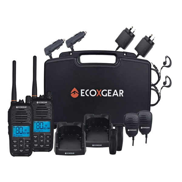 Ecoxgear ECOXTALK EXG500-2PK Long Range UHF CB Handheld Radio - ECOXGEAR ECOXTALK 5.0W MAX Output Power EXG500-2PK UHF CB Handheld Radios Delux Pack feature a full IP67-rated waterproof and dustproof design that floats in water. When the EXG500 is dropped into water, the Led light will be automatically activated. Ideal for Outdoor Activities: Stay in touch, especially when mobile phone reception is weak. Live RSSI Active Display (Received Signal Strength Indicator) - Live Visual Signal Strength and squelch level Indicator allowing you to adjust the squelch level to meet surrounding signal activity. With a long range of up to 17Km and 30 hours of the operation time, you will always stay connected. Removable Flexible Antenna allows you to connect to ATPA230 antennas.