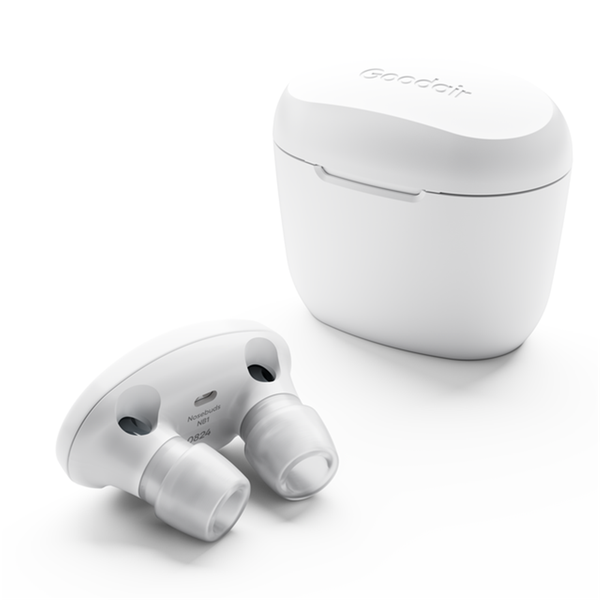 Goodair Nosebuds Nosebuds provide an effective, drug-free solution to relieve symptoms of nasal congestion and harness the body's natural processes to relieve nasal congestion. We believe in the power of nasal breathing as a solution to better health. Goodair Nosebuds enhance the body's natural ability to fight symptoms of nasal congestion and find lasting relief, that's as easy as breathing. Through gentle nasal breathing and the modulation of airflow, Nosebuds create a soothing hum, stimulating nasal passages to clear mucus, reduce congestion, and enhance nasal airflow. - Clinically tested for fast, effective relief- Reusable, rechargeable, and washable- Use for as little as 20 minutes per day - anytime, anywhere- Nosebuds come pre-installed with silicone tips, with six alternative sizes included so you can find the fit that works best for you.- Nosebuds take 90 minutes to fully charge, with a full charge providing 60 minutes of use.- Place Nosebuds in the docking case, use the supplied USB charging cable to plug into a USB-A power supply.- Keep your Nosebuds and case clean by wiping with a damp cloth, and do not submerge in water.- Silicone tips can be removed and washed in warm soapy water