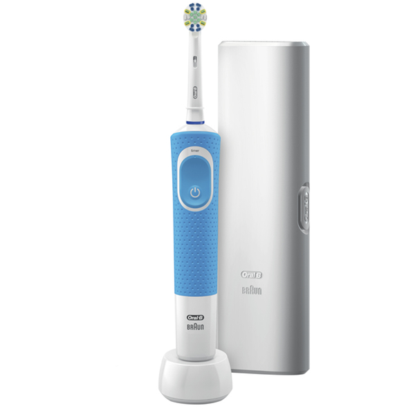 The Oral-B Pro 100 has a waterproof handle, charging station, travel case, and a Floss Action brush head. 2D cleaning action oscillates and rotates for better plaque removal than a regular manual toothbrush and an in-handle timer helps you brush for a dentist-recommended 2 minutes.