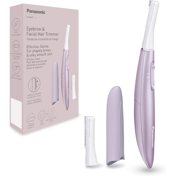 - Gentle, rounded hypoallergenic stainless-steel blades- Flexible design with two blades for eyebrows and face- Compact and portable- Battery operated Gentle. Effective. For shapely brows and silky-smooth skin. Panasonic's Eyebrow &; Facial Hair Trimmer comes with two blades in one compact design. Use it to shape eyebrows and remove unwanted facial hair and peach fuzz. Perfect for use at home or touch ups on the go. Two Blades for Shaping Brows and Smooth Skin Two blades in one flexible design makes it easy to achieve beautifully smooth skin and well-defined eyebrows. Use the Eyebrow Blade to shape and style your brows and switch to the Facial Hair Blade to remove peach fuzz and leave skin feeling smooth. Rounded Stainless-steel Blades to Protect Skin Benefit from hypoallergenic Japanese rounded blades for hygienic and gentle hair removal to leave skin feeling soft. The blades are stainless steel to remain sharp, durable and limit the need for frequent replacements. Flexible Swing Head for a Smooth Finish The blade design follows the contours of your skin to ensure close hair removal while being gentle and without missing a hair. This makes it easy to remove fine hairs without putting any strain on the skin. Fast and Efficient with a Quick Swipe With just a quick swipe, unwanted facial hair and peach fuzz can be removed swiftly and effectively. Convenient to use dry at home or on the go, there's no need to apply cream or soap before use. Compact and Travel-Friendly Weighing only approx. 31g*, this compact, slim, and light tool can be easily carried in a pouch with the Protection Cap on. Since it operates on a single battery, there's no need to bring a charger. * Cap and battery included, when the facial blade is attached.