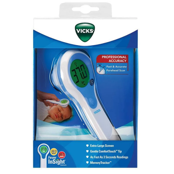 Vicks Thermometer Forehead Non-invasive design is suitable for use, even on a baby Fever Insight colour display system helps you better understand the meaning of your child's temperature Clinically proven accuracy Fast 3-second readings Comfort Touch sensor for gentle, precise temperatures every time Easy to hold and use Memory Tracker recalls last 12 temperature readings Good for all ages Directions and Ingredients - The Vicks Forehead Thermometer is quick and easy to use. - For an accurate reading, it is recommended that several steps be taken. - Firstly, for 15 minutes prior to use, avoid eating or drinking any liquids, exercising, taking showers or baths, or smoking. - Before placing the thermometer sensor onto the forehead remove any hair, sweat, dirt or make up. - To use, simply press the on/off button to activate the thermometer. - The last reading will be displayed for 3 seconds with the <> icon. - When the oC icon is flashing the unit will beep to indicate it's ready to measure. - Place the probe gently and flush onto the forehead. - Press the on/off button once and release it. Steadily move the thermometer along the forehead. - A long beep will sound after 3 seconds to indicate the reading has been taken. - The LCD display will show the temperature in oC with a backlit colour to indicate either a normal, slightly elevated or possible high fever. - For a possible fever, over 37.5 oC, 10 short beeps will sound.