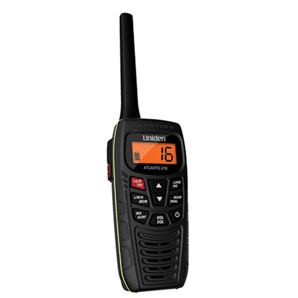 Atlantis 270 The Uniden Atlantis 270 features all USA, International and Canadian marine channels. It also meets IPX7 submersible waterproof standards. The Atlantis' brilliant backlit LCD display makes it easy to use, day or night for the power to go anywhere. Key Features - NEW Floating Design- IPX7 Submersible Waterproof Level- 10-Hour Battery Life- Selectable 1 / 2.5 / 6 watt Transmit Power- Display Size: 18mm x 37mm- Large Easy-to-Read Backlit LCD- Power Boost Key- AC &; DC Adapters Included- Charging Cradle- Glow Seals