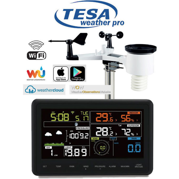 TESA WS2900C PRO Weather Station - Prof 7 Inch Colour WIFI A professional-grade weather station coupled with a 7 colour LCD that will measure almost anything planet earth can throw at it. It's capable of displaying temperature, wind speed, wind direction, wind chill, barometric pressure, and dew point. These readings are sent from the outdoor solar transmitting sensor and indoor sensor built into the display. You can see how much rain has fallen in 1 hour, a day, a week, or a month, see the current UV index reading, and even see the current lux measurement outdoors which is great for those who have rooftop solar arrays. Install the sensors outside and the readings will be transmitted wirelessly to the base unit up to 100m away. TESA newest professional WIFI weather station allows you to monitor your home and backyard weather conditions with the brilliant, easy-to-read LCD colour display. The enhanced Wi-Fi connectable option that enables your station to transmit its data wirelessly to the world's largest personal weather station network, Weather Underground and view data on your mobile device. - Colour film LCD display base station touch keys - Built-in WIFI module - Auto uploading data to the net server - Time and date update from the server - Auto DST - Calendar (Month/date, 2000-2099) - Time (hour/minute) - In/Outdoor Temperature/Humidity in C/F - In/Outdoor Temperature/Humidity Trend - Display wind, gust and wind direction - Wireless Wind and Wind direction with a 1-degree resolution, accuracy: +/-12degrees - Wind speed in ms, km/h, mph, knots and bft (accuracy: <10m/s: +/-1m/s, >=10m/s: 10%) - Wireless Rainfall - Rainfall in inch, mm (accuracy: +/-10%) - Display rainfall in rate, event, day, week, month and total. - Alerts for indoor and outdoor temperature &; humidity - Alerts for rain rate and rain day. - Alerts for wind speed. - Weather forecast: Sunny, Partly Sunny, Cloudy, Rainy, Stormy and Snowy - Pressure display with hpa, mmhg or inhg unit. - Heat index, wind chill and dew point for outdoor - High/Low records for indoor/outdoor temperature/humidity - MAX/MIN data records. - High/Mid/Off backlight controlled - User accuracy calibration supported - Automatically to saved user-set parameters (unit, calibration data, alarm data...) into EEPROM. - When DC power adapter is connected, backlight is on permanently. When only battery-operated, the backlight is turned on only when the button is pressed and auto time out is 15s. Here is the WS2900C works on collecting information and display on PC browser. Here the example links: https://www.wunderground.com/dashboard/pws/IAUCKL265 Example data in table : Full 5min interval data at : https://www.wunderground.com/dashboard/pws/IAUCKL265/table/2021-10-29/2021-10-29/daily