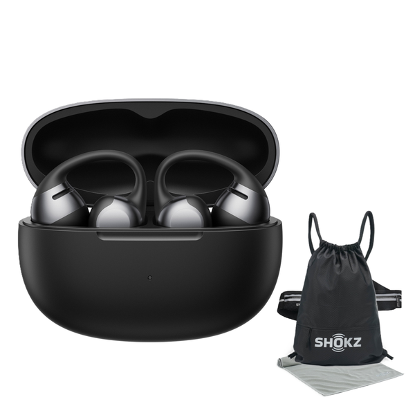 Shokz OpenDots ONE Premium Open-Ear True Wireless Clip-On Sports Earbuds - Black - Bonus Shokz Sports Pack - Drawstring Bag + Sports Belt + Microfibre Towel