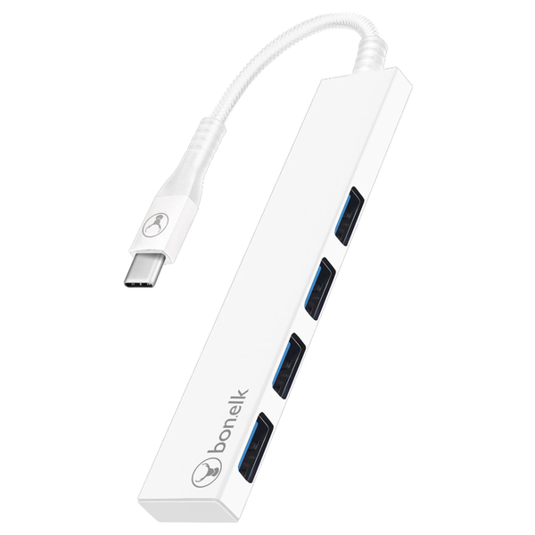 The Bonelk USB-C hub is a great solution to connect up to 4 additional USB-A high speed devices to your laptop, smart device or desktop computer. Built using high quality materials and intelligent electronics. Features 1 x USB-C male port to 4 x USB-A 3.0 female ports that support 5 Gbps transfer speeds, encased in a premium grade aluminium housing. Complete with a durable Long-life cable with braided nylon jacket and FLEX-SR™ strain relief. USB 3.0 PORTS Connect up to 4 additional USB-A high speed devices to your laptop, smart device or desktop computer. USB-C CONNECTION Convert 1 x USB-C port into 4 x USB-A 3.0 female ports that support 5Gbps transfer speeds. FLEX-SR™ TECHNOLOGY State of the art strain relief, made from flexible material with multi-rib design to withstand bends. BRAIDED CABLE Durable and long-lasting double braided nylon cable jacket. PREMIUM MATERIALS Built using high quality materials and intelligent electronics encased in a premium grade aluminium housing. CARRY POUCH Included carry pouch made from premium soft touch fabric with press stud closure to store your adapter for travel or when not in use.