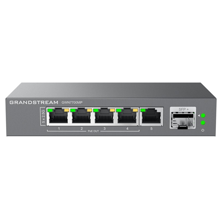 The Grandstream GWN7700MP is an unmanaged 2.5 Multi-Gigabit switch featuring 5 x 2.5 GigE ports (4 of which support PoE) and 1 x SFP+ port. Part of the GWN7700M series, these switches are designed to deliver high-speed network connectivity up to 2.5Gbps, making them ideal for home offices and small-to-medium businesses. The series includes 6- and 9-port models that support fast Ethernet, 1-Gigabit, and 2.5-Gigabit network speeds, along with 1 SFP+ fiber port offering 1-Gigabit or 10-Gigabit uplink connectivity for flexible and powerful network expansion.
