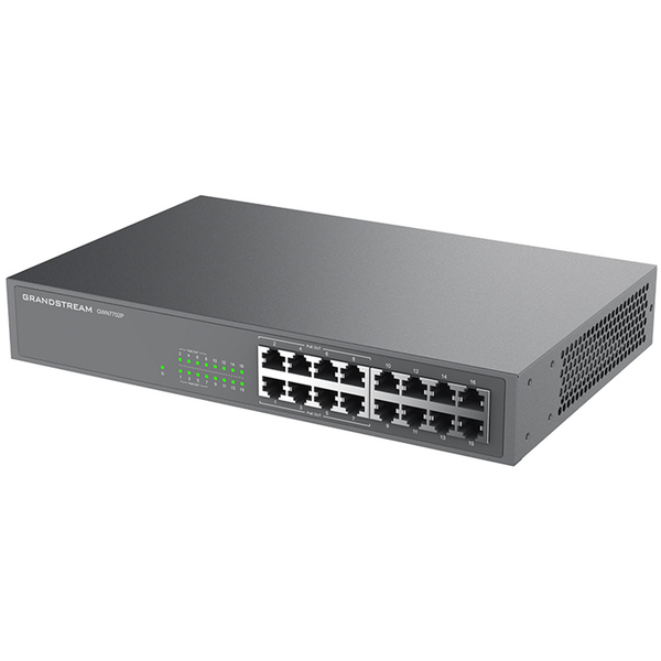 Grandstream GWN7702P 16 Port Gigabit Unmanaged Network Switch with 8 Ports 802.3af/at PoE The GWN7700 series are unmanaged network switches that provide a quick and cost-effective way to add high-speed Gigabit connectivity to home offices and small/medium businesses. It requires no configuration or installation, offers a desktop and wall-mountable design, and provides auto MDI/MDIX to eliminate the need for crossover cables. Each port supports auto-negotiation to allow the GWN7700 series to recognize the link speed of any 10/100/1000Mbps network device and intelligently adjust for compatibility and optimal performance. The PoE (Power-over-Ethernet) models provide ports with IEEE 802.3af/at compliant, smart dynamic PoE output to power IP phones, IP cameras, Wi-Fi access points and other PoE endpoints. The plug-and-play GWN7700 series are the ideal unmanaged network switches for home offices and small-to medium businesses. Features - 16 Gigabit RJ45 ports with 8 x 30W port PoE+ output - Green technology reduces power consumption - Broadcast/Multicast/ Unicast Storm Control (fixed to 100Mbps) to monitor traffic levels - Supports long cable connection - QoS - Supports Default Strict Priority when present