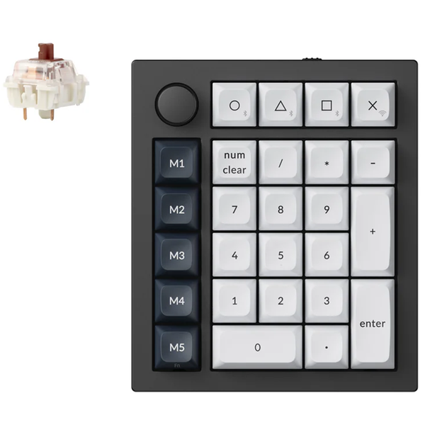 Keychron Q0 Max Introducing the Q0 Max, a full-metal custom number pad with a macro column and rotary encoder knob on the left side. Available as a separate numeric keypad or a huge customizable key set with QMK/VIA support, Q0 Max is a cluster of function and appearance, offering superior performance such as 2.4 GHz wireless, Bluetooth 5.1, 1000 Hz polling rare, upgraded acoustic foams, double-gasket design, PBT keycaps, and more to elevate your productivity and typing experience. 2.4 GHz &; Bluetooth Connection Experience peak gaming performance on the fly with the 2.4 GHz wireless connection boasting a rapid 1000 Hz polling rate. For seamless multitasking across your computer, phone, and tablet, you can effortlessly connect the Q0 Max via Bluetooth 5.1 to three devices. A Refined Piece Of Metal Art The mini metal body is crafted with 6063 aluminum that is processed through CNC machined, polished, anodized, sandblasted, and undergoes 24 more manufacturing stages to make this solid metal piece of art that is the Q0 Max. Optimized Typing Experience Elevate the typing experience with a combination of premium acoustic foams such as IXPE, PET, and Latex. Each keystroke becomes enjoyable, making every tap a delight for the senses. Plus, We designed every component to be able to assemble easily so you can customize and adjust each component with ease to create your ultimate typing experience. An Epic Core Inside The Keyboard A powerful ARM Cortex-M4 chip (MCU) equipped with 256K Flash will provide more flexibility for developers. The polling rate is 1000 Hz right out of the box on 2.4 GHz and wired modes (90 Hz on Bluetooth mode), which makes the latency hardly noticeable even in competitive games. Double-Gasket Design The Double Gasket Design is a new innovative structure in the industry. In addition to the gaskets on the plates, we added silicone pads between the top and bottom cases to significantly reduce the acoustic resonance between the metals and reduce the noise of the impacted metals. KSA Double-Shot PBT Keycaps To further fine-tune your typing experience, we designed our unique Keychron spherical-angle (KSA profile) double-shot keycap set with premium non-backlight shine through PBT material, that is oil-resistant and durable for long-term use. Program with QMK &; Launcher. The open-source QMK firmware means endless possibilities for key remapping, macros, shortcuts, and more. Now you can easily customize each key with the Keychron Launcher web app. Hot-Swappable Every detail matters for a personalized typing experience, that's why we give you the power. You can hot-swap every switch on the Q0 Max with almost all of the 3pin and 5pin MX style mechanical switches on the market (including Cherry, Gateron, Kailh, Panda, etc.) without soldering required. South-Facing RGB The south-facing RGB LED is designed to better illuminate the number pad backlight from the typist's angle with the premium non-shine-through PBT keycaps installed. The south-facing RGB is also free from interference when the users install KSA, OEM or Cherry-profile alternative keycaps on the number pad. Screw-In PCB Stabilizers No detail is too insignificant when it comes to your fingertip feel. We've integrated the PCB-mounted screw-in stabilizers for a smoother typing experience with less wobbliness on the big keys (0, +. enter). You can even customize your favorite stabilizers on your own.