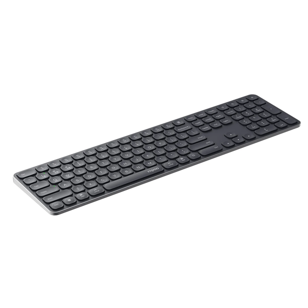 Rapoo E9550L Multi-Device Wireless Keyboard Blade-Series Multi-Device and Multi-OS Wireless: Seamless switching between 4 devices such as laptop, desktop computer, tablet or smartphone without hassle of swapping and reconnecting the keyboard back and forth. Quiet and Comfortable: Featuring RAPOO's classic blade-series ultra-thin design, E9550L delivers a fluid, precise and quiet typing experience at a natural angle for your wrist --- thanks to its 0.2-inch thickness that contributes less wrist strain, making extra palm rest no longer needed. 110-Key Complete Layout: A standard keyboard with number pad and all the keys you need, the well-spaced chiclet keys deliver fast fluid laptop-like typing, the 12 multimedia hotkeys provide quick access to most widely used functions such as play/pause, volume +/-, email --- Windows and Mac OS dual-system supported. Rechargeable with 90-Day Battery Life: Upgraded with our latest low-power technology, the E9550L wireless keyboard can run up to 90 days on a full charge. In addition, the USB-C supports a whole day use on a 10-minute fast charging. Aesthetic and Heavy Duty Design: Adapts aluminum alloy frame with matte antioxidant finish, adding a delicate texture and aesthetic look to your setup. Experience an enhanced convenience, reliability, and stability with RAPOO's latest blade-series keyboards. Refined Details from Customer Voice: The latest version has added device and capitalization indicator lights for making it easier to find which device you are typing on, and eliminating the inconvenience caused by not knowing the uppercase or lowercase; What's more, we've also added a battery indicator for better power management.