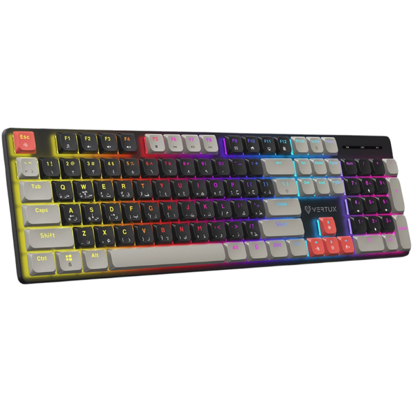 Experience the seamless fusion of precision and style with Vertux's StealthKey, a high-performance mechanical gaming keyboard designed for the avid gamer. Engineered with low-profile, dust-proof keys and featuring a full-sized layout, this keyboard effortlessly balances work and play. Its ultra-responsive switches offer 50 million keystrokes of reliability, while the integrated stabilizers on larger keys ensure unparalleled accuracy. Illuminate your setup with 17 dynamic rainbow LED modes, all housed in a sleek, compact design that promotes ergonomic comfort and typing ease. Elevate your gaming and office experience with the StealthKey-where innovation meets versatility, without compromise. Precision-Engineered Full-Size Keyboard Dominate every task with this 104-key full-size layout, designed for seamless navigation and maximum productivity. Its responsive build ensures every keystroke is precise, giving you an edge in gaming and work. Low-Profile, Dust-Proof Construction Sleek and durable, this low-profile keyboard features dust-proof keys to prevent debris buildup, keeping it in peak condition for long-lasting performance and tactile feedback.