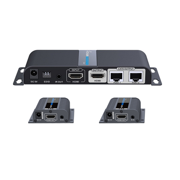Introduction This HDMI extender splitter includs one transmitter and two receivers, extend 1 HDMI source to 2 HDMI displays over single CAT6/6a/7 cable up to 40m/131ft. The highest resolution supported is 1920 x 1080 @60Hz, and it supports IR passback, EDID pass through and only one power adapter for the transmitter is needed,the Receiver is powered by the transmitter over CAT6 cable. Ideal solution for HDMI exhibition, Video conference and show center, ect. -Support EDID. -Plug and play.-Support one HDMI Loop-out.-Support 20~60KHz IR pass back. -Wall-mounted function, easy installation.-Compatible with CAT6/6a/7 network cables.-The transmission distance is 40m/131ft.-The Highest resolution is up to 1920 x 1080 @60Hz.-Support power from transmitter to receiver unit over the CAT6 cable.-Distribute 1 HDMI source to 2 HD displays over network cable simultaneously.