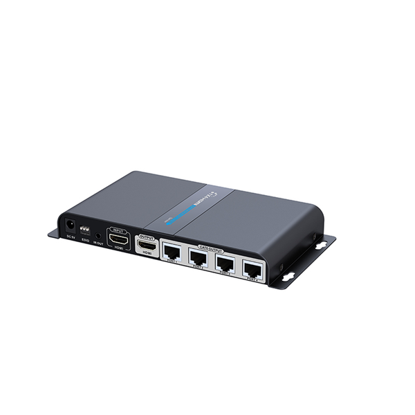 This HDMI extender splitter works with 4 HDMI CAT6 extender receivers to split and extend 1 HDMI source to 4 HDMI displays over single CAT6/6a/7 cable up to 40m/131ft. The highest resolution supported is 1920x1080 @ 60Hz, and it supports IR passback, EDID pass through and only one power adapter for the transmitter is needed, the Receiver is powered by the transmitter over CAT6 cable. Ideal solution for HDMI exhibition, Video conference and show center, ect.-Distribute 1 HDMI source to 4 HDMI displays over network cable simultaneously.-Support one HDMI Loop-out.-Compatible with CAT6/6a/7 network cables.-The transmission distance is up to 40m/131ft.-The highest resolution supported is 1920x1080 @ 60Hz.-Support 20~60Hz IR pass back.-Support EDID Setting function. -Support power from transmitter to receiver unit over the CAT6 cable.-Plug and play.-Wall-mounted function, easy installation.