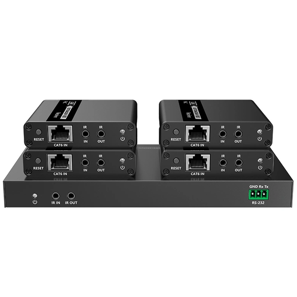 1-In-4-Out 4K@30Hz HDMI Extender. 1x HDMI in & 4x RJ45 out. Compatible with CAT6/6A/7 Cables, Transmit up to 70m, Plug & Play, Wall-mountable, Supports EDID, Includes 1x Transmitter & 4x Receiver.
