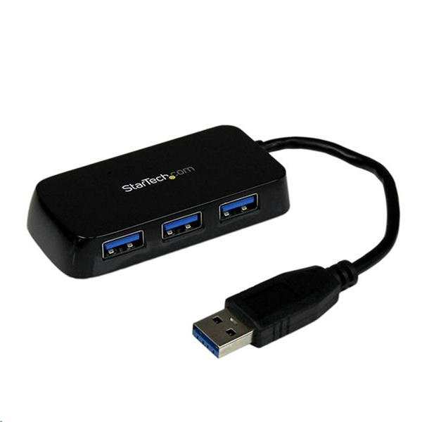 The ST4300MINU3B Portable 4 Port SuperSpeed Mini USB 3.0 Hub (Black) lets you expand your USB connectivity by turning a single USB 3.0 port into four external USB 3.0 ports. The integrated cable design makes this mini USB hub the perfect accessory for your Mac® / PC notebook or Ultrabook™ computer. The 4 Port USB 3.0 hub supports USB 3.0 data bandwidth (5 Gbps - up to 10x more than USB 2.0) and is backward compatible with USB 2.0 and 1.1 devices, ensuring flawless performance from all of your USB peripherals/devices, regardless of their age. Ideal for home and business users who require portability, the external USB 3.0 hub is USB-powered and features a rugged, compact design with a built-in cable so no additional cables are needed to connect the hub to your system. Backed by a StarTech.com 2-year warranty and free lifetime technical support.The StarTech.com Advantage- Connect up to four USB 3.0/2.0/1.x devices simultaneously at their maximum speeds- Compact design with a built-in cable for ease of use and portability