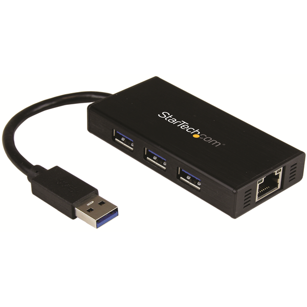 The ST3300GU3B Portable USB 3.0 Hub features an integrated GbE port, enabling you to expand your laptop connectivity by adding three external USB 3.0 ports, as well as a Gigabit network port via a single USB 3.0 connection. This hub is an ideal laptop accessory for your Microsoft Surface™ Pro 4, Surface Pro 3, Surface Book, Dell™ XPS 13, and many other devices. The hub merges Gigabit network support and USB 3.0 hub access into lightweight yet sturdy aluminum casing, providing vital connectivity ports that are often limited or nonexistent on modern mobile computers, while remaining compact and travel-friendly. Plus, with an attached USB 3.0 host connection cable there's no need to carry a separate cable with you, so you can tuck the hub neatly into your laptop bag for maximum portability. For faster and more consistent network connections, the integrated Ethernet port leverages the 5Gbps capabilities of the USB 3.0 interface to provide wired Gigabit access that is fully compatible with IEEE 802.3/u/ab standards. Plus, the GbE port supports Wake-on-LAN (WOL), so you can remotely wake your computer over your network. An ideal laptop accessory, this mobile USB hub is great for connecting low-power peripherals like a mouse, keyboard or USB flash drive, and also includes a universal power adapter for connecting devices such as external hard drive enclosures. Backed by a StarTech.com 2-year warranty and free lifetime technical support. The StarTech.com Advantage- Only requires a single USB 3.0 port to connect up to three additional USB 3.0 devices, plus a Gigabit network- Take the adapter anywhere with a compact, portable, and travel-friendly design- Sleek and lightweight, with black aluminum casing and attached USB 3.0 cable
