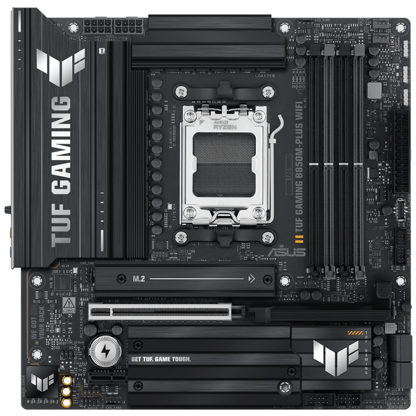TUF GAMING B850M-PLUS WIFI ASUS TUF GAMING B850M-PLUS WIFI takes all the essential elements of the latest AMD Ryzen™ processors and combines them with game-ready features and proven durability. Engineered with military-grade components, an upgraded power solution and a comprehensive cooling system, this motherboard goes beyond expectations with rock-solid and stable performance for marathon gaming. TUF GAMING motherboards also undergo rigorous endurance testing to ensure that they can handle conditions where others may fail. This platform delivers the power and connectivity that advanced AI PC applications demand. AI Advisor ASUS AI Advisor is an ASUS technical expert that's always available to answer your questions. Owners of compatible ASUS motherboards can interact with this AI-powered technology using natural language to learn more about their hardware. For DIY beginners, it can provide easy-to-understand explanations of one-click optimization features like AI Overclocking and fan speed tuning, and for seasoned PC-building veterans, it can offer guidance and instructions on the latest features offered by ASUS. UEFI BIOS The UEFI interface delivers easy-to-use configuration options for PC beginners, and advanced features for veterans. ASUS DriverHub Simplify driver management with automatic detection, one-click installation and update for smooth, efficient system performance. ASUS GlideX Enable seamless screen sharing and control across PCs, tablets, and smartphones via USB or WiFi, supporting multiple platforms. Power Saving Leverage all-around energy efficiency settings to optimize power consumption. Armoury Crate Customize Aura Sync RGB and control ASUS devices. Includes product registration and updates. Premium Power Design Stable power is crucial for maximizing the performance of AMD processors. The motherboard is designed to meet the needs of high-core-count CPUs. It features 14(80A) + 2(80A) + 1(80A) power stages that integrate high-side and low-side MOSFETs and drivers into packages rated for up to 80A each. This configuration ensures optimal power delivery, efficiency, stability and performance for both current and future AMD processors. DRAM Overclocking Performance Comprehensive memory tuning options are the cornerstone of TUF GAMING motherboards. With the motherboard, you can extract all the potential out of your DDR5 modules*, whether they're from an extreme-speed kit or an entry-level set that would otherwise be locked. DDR5 DOMINANCE For those who want to fly past stock DDR5 speeds, this motherboard is primed and ready for enthusiast-grade kits, courtesy of vast AMD Extended Profiles for Overclocking (EXPO™) support. Seasoned veterans can further tweak performance via an extensive array of settings in the UEFI. ASUS AEMP ASUS Enhanced Memory Profile (AEMP) is an exclusive firmware feature for PMIC-restricted memory modules. AEMP automatically detects the memory chips on your kit and then presents optimized frequency, timing and voltage profiles that you can quickly apply. M.2 PCIe 5.0 Support This motherboard also features one PCIe 5.0 M.2 slot to enjoy the fastest data transfers of up to 128 Gbps*, and all M.2 slots support NVMe RAID configurations to take advantage of the latest available speeds. Cooler Compatibility ASUS AIO coolers offer robust performance, high overclocking potential, bold aesthetics and customizable functionality for new TUF Gaming motherboards, empowering you to build your dream gaming rig. PCIe 5.0 for Graphics Card? PCIe 5.0 offers twice the data transfer speed of PCIe 4.0, making it robust enough to handle new data-heavy tasks. PCIe 5.0 also brings other benefits, such as electrical changes to improve signal integrity, backward-compatible CEM connectors for add-in cards and backward compatibility with previous versions of the PCIe bus. Rear USB 20Gbps Type-C® Extensive USB support ensures connections to a wide array of external devices. This motherboard includes a USB 20Gbps Type-C® port on the rear I/O panel that delivers transfer speeds of up to 20Gbps. Front USB 10Gbps Type-C® This motherboard features a USB 10Gbps Type-C® front panel connector for speedy data transfers of up to 10Gbps. WiFi 6E Onboard WiFi 6E technology takes advantage of the newly available radio spectrum in the 6 GHz band. It delivers ultrafast wireless networking speeds and improved capacity, as well as better performance in dense wireless environments.* 2.5Gb Ethernet On-board 2.5Gb Ethernet kicks your LAN connection up a notch by improving bandwidth speeds by up to 2.5X. Using your existing LAN cable, you can take advantage of this networking upgrade to reduce lag, experience smoother high-resolution video streams, and enjoy faster file transfers.? Realtek 7.1 Channel Audio This motherboard utilizes an audio codec designed in close collaboration with Realtek - the Realtek ALC1220P. It features an unprecedented 120 dB signal-to-noise (SNR) ratio for the stereo line out and a 113 dB SNR for the line in, providing pristine audio quality. Additionally, an impedance-sensing circuit automatically adjusts gain to ensure an optimal volume range for your headphones. DTS Audio Processing DTS® Audio Processing enhances gaming headset and speaker audio experiences by reducing distortion and by providing deeper bass, so games, movies and music sound better. It also allows you to customize audio settings. Outshine The Competition A well-tuned system deserves a matching aesthetic. The TUF GAMING motherboard features edge lighting to enhance its rugged look, and ASUS Aura offers full RGB control with presets for built-in LEDs and third-party strips. It can all sync with an ever-growing portfolio of Aura-compatible hardware.? Addressable Gen2 RGB Header Three addressable Gen2 RGB headers will support up to 500 LEDs on Gen2 RGB devices, empowering Aura Sync to automatically tailor lighting effects across your whole system. The headers also offer full backward compatibility wit